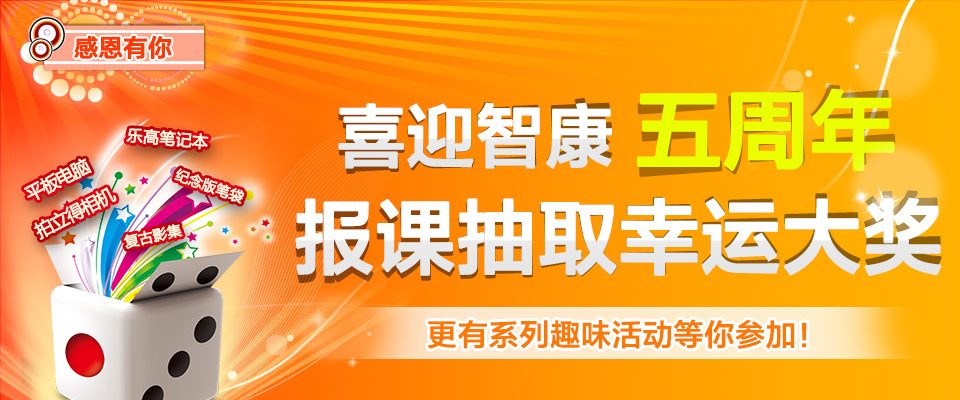 學知五載,智康1對1教書育人5周年之際,為了回饋廣大家長和學員的厚愛,特別推出“新學期新氣象,喜迎智康五周年,報課抽大獎”活動。凡在活動期間新簽并交清全款或續(xù)費的學員即可在校區(qū)前臺領取一張刮刮卡,參與報課抽獎活動。人人有獎,最少為五等獎,快來參加吧!