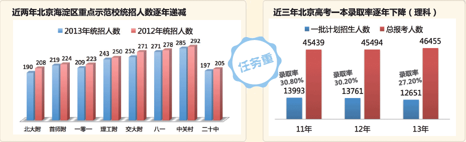 2013年,在北京,一名中考考生要面臨92698名競爭對手,其中只有26.3%能進入示范高中。一名高考考生(理科)面臨46454名競爭對手,其中只有27.2%能考入一本。2014年,還將更加激烈!